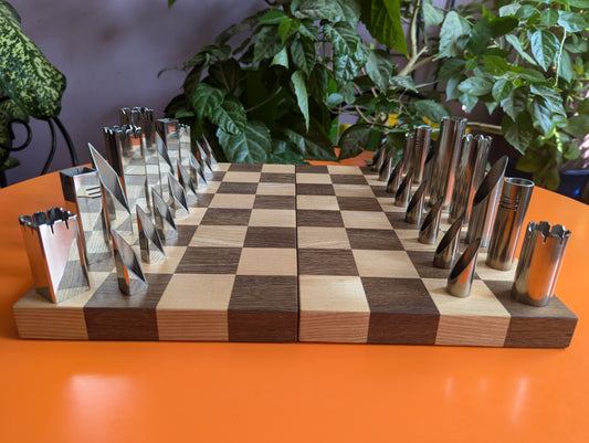 Foldable Stainless Steel Chess Set with Wooden Chessboard/box. Handmade.