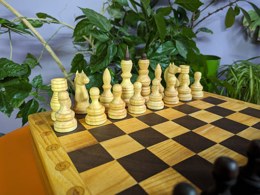 Handcrafted Chess Chest with wooden carved chess pieces inside and with chessboard on top.