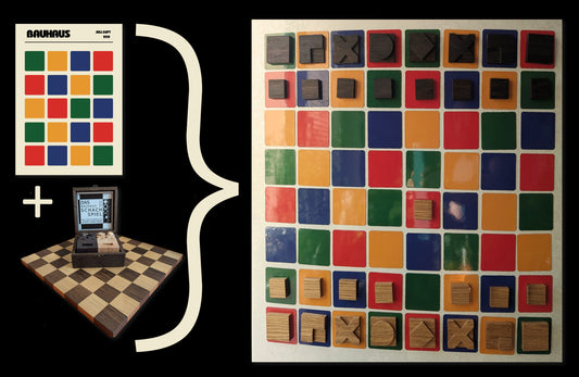 Handmade vertical magnetic chess set. Wooden flat Bauhaus inspired chessmen with Art chessboard