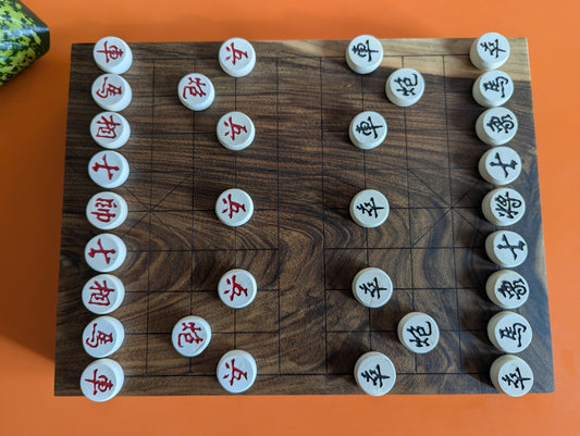 Solid walnut Xiangqi game set. Hand carved lines