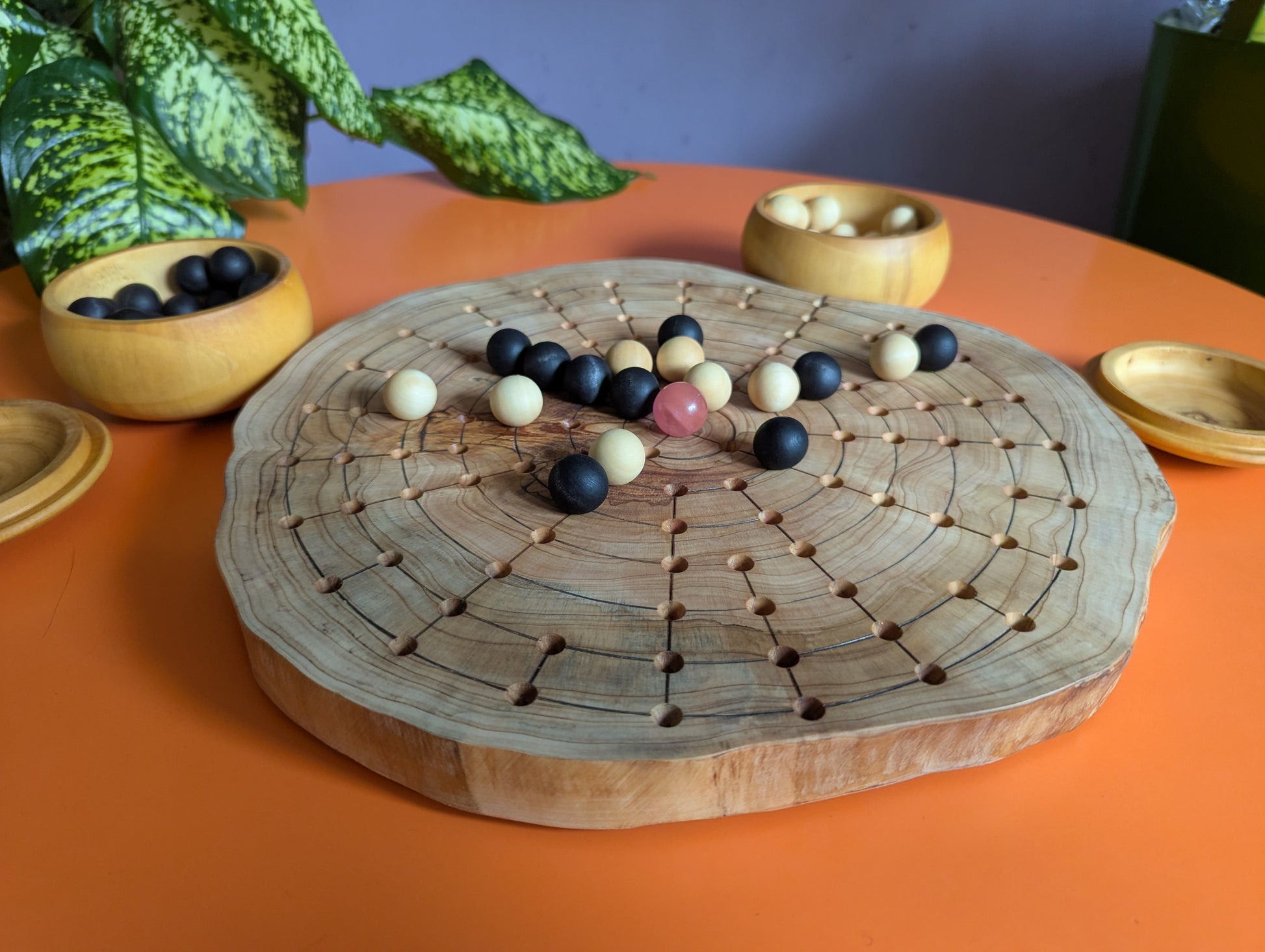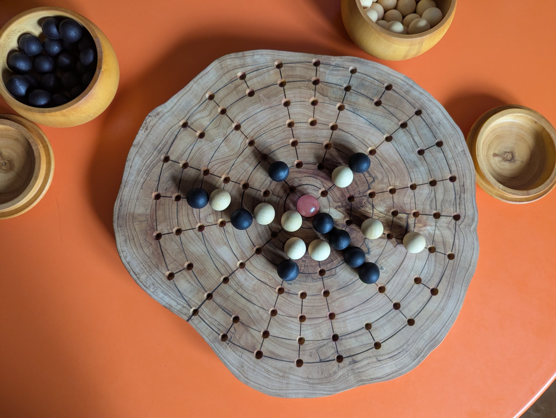 Full set contains Board, 1 Navel stone, 54 wooden pieces, 2 wooden bowls.