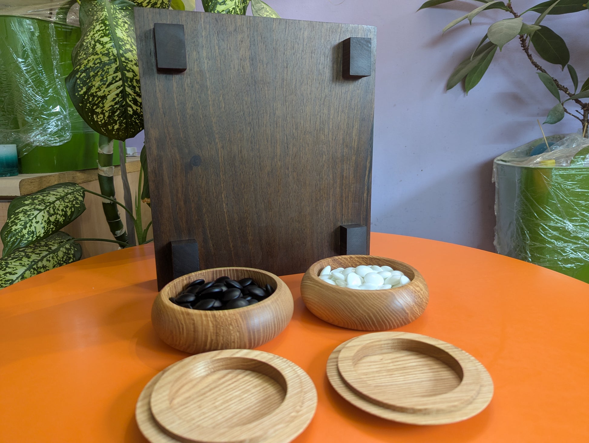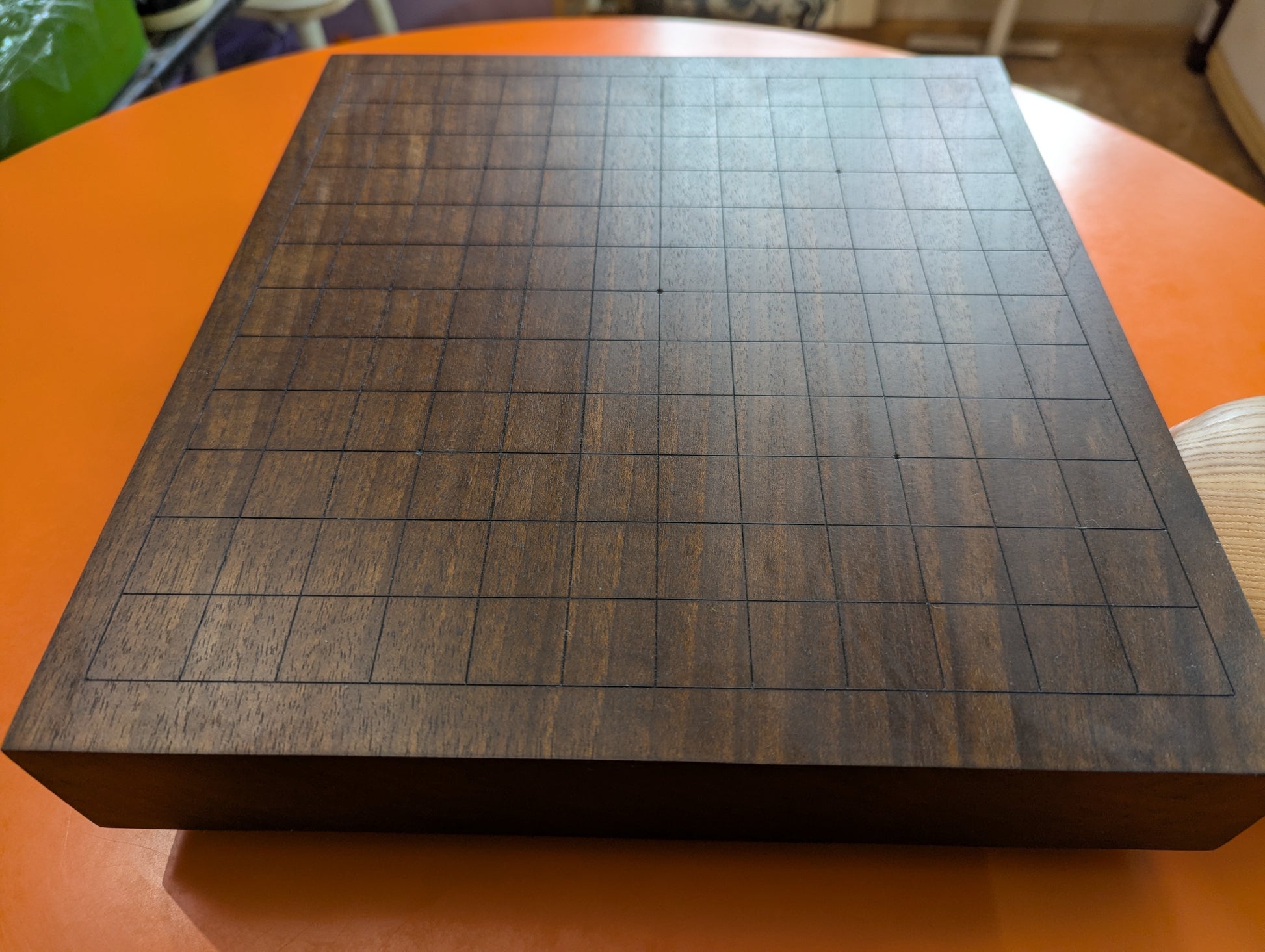 The goban is made of solid walnut wood, covered with linseed oil and wax.