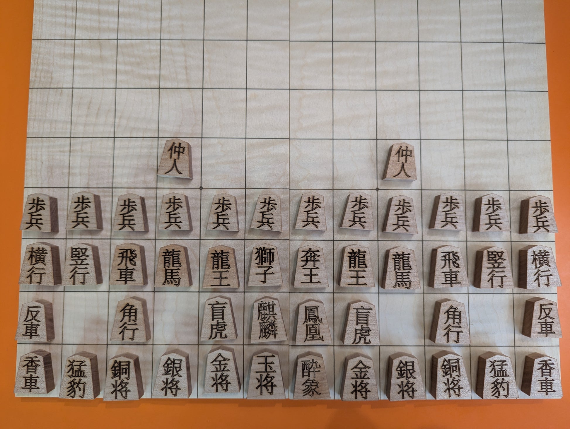 Foldable Chu Shogi game set. Handmade borderless solid Maple Middle Shogi
