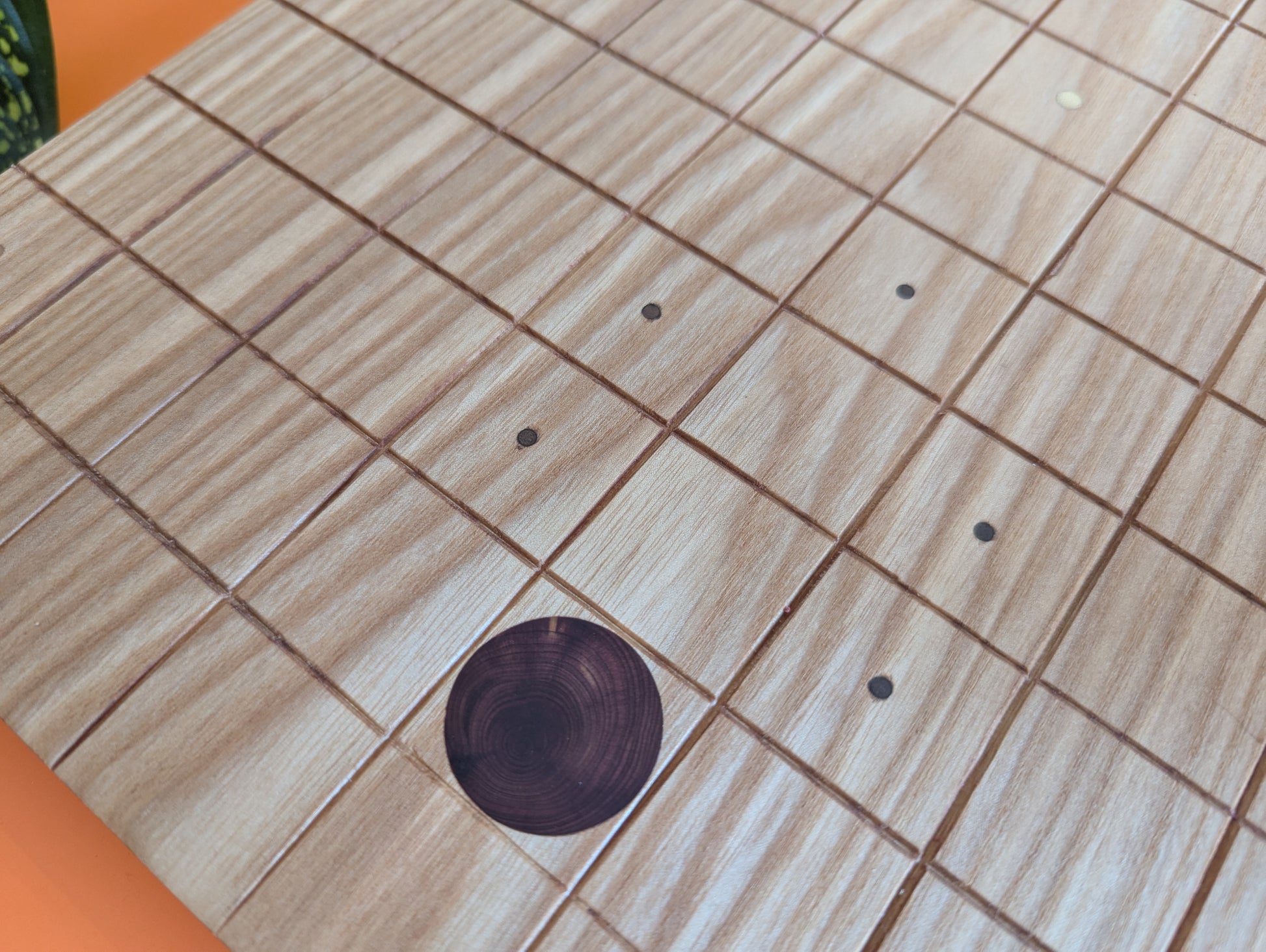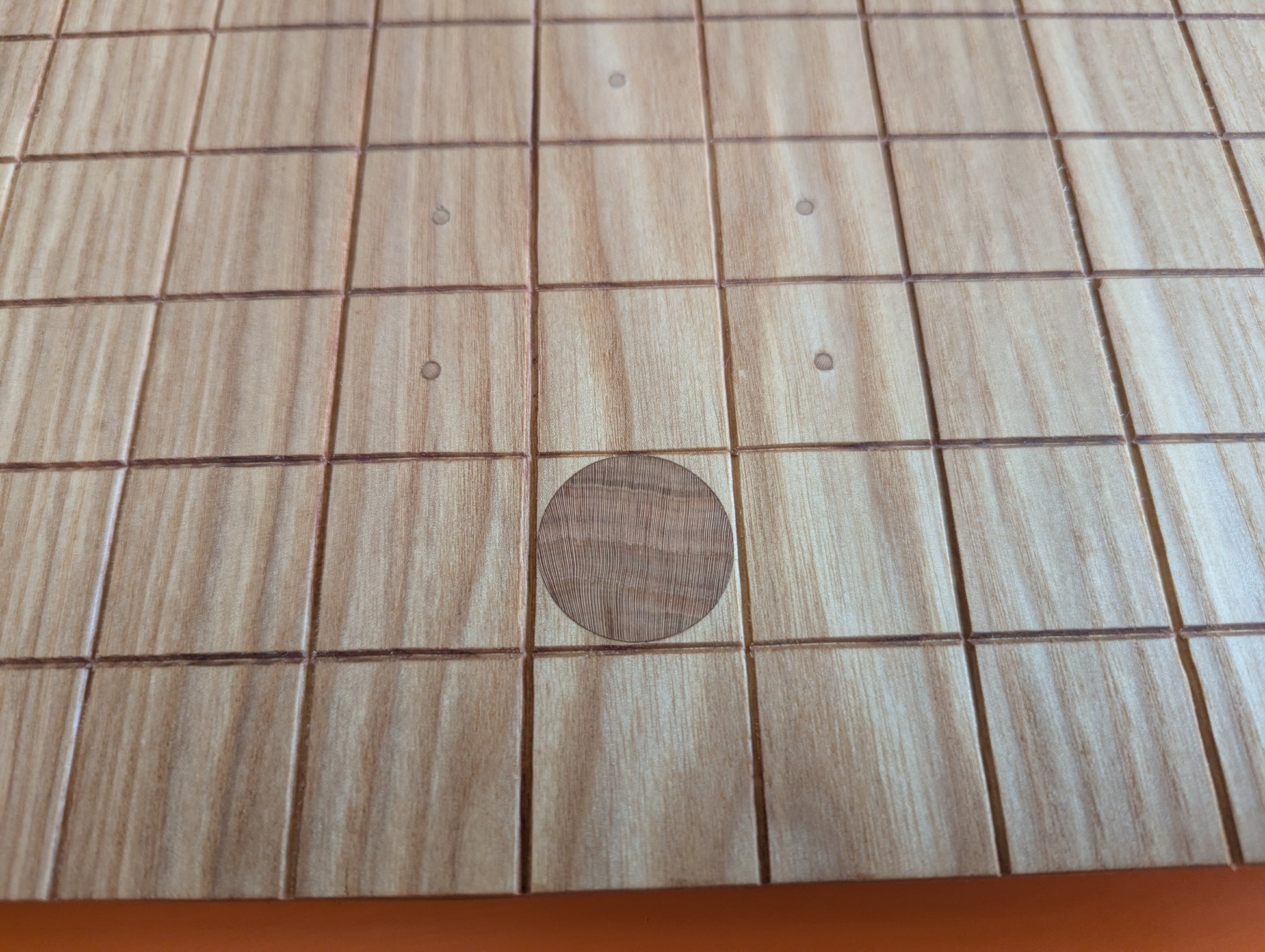 The bases and initial placement of the pieces are indicated by insets of other wood species. The woods used were walnut, maple, bamboo, pear, and juniper.