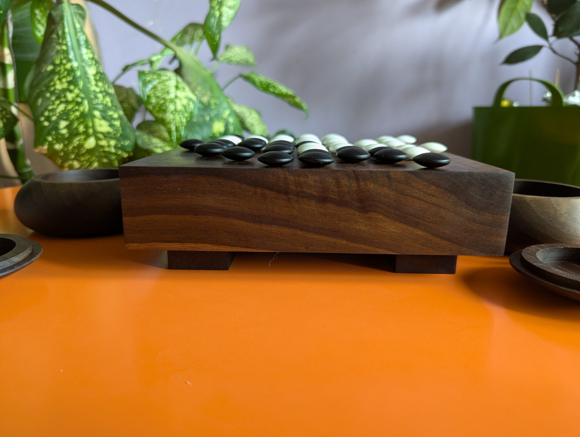 The goban is made of solid black walnut wood, covered with linseed oil and wax.